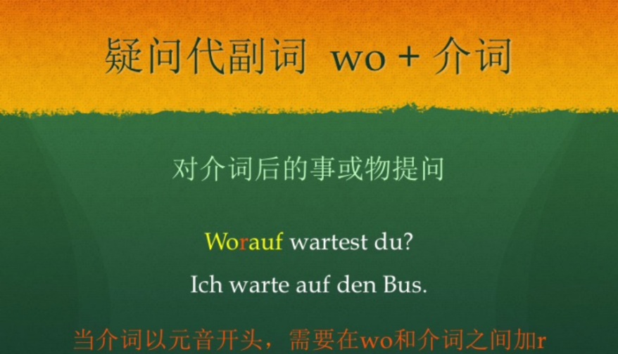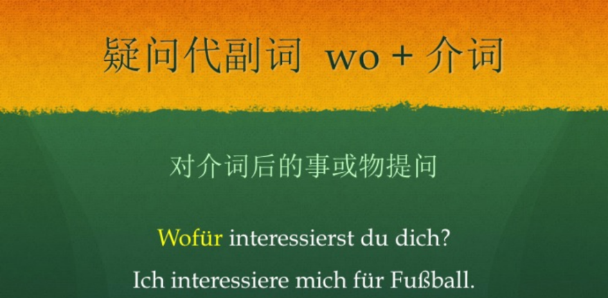我们想针对Fußball提问, 问句是,你对什么感兴趣?Wofür interessierst du dich? 也就是说我们使用疑问代副词wo + 介词来对介词后的事或物来提问。