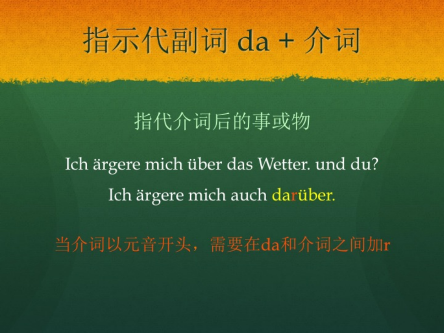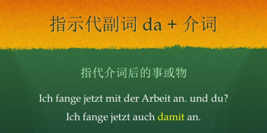 接下来我们看指示代副词,它是用来指代介词后的事或物。来看一个句子,Ich fange jetzt mit der Arbeit an, und du? (我现在开始工作,你呢?)。