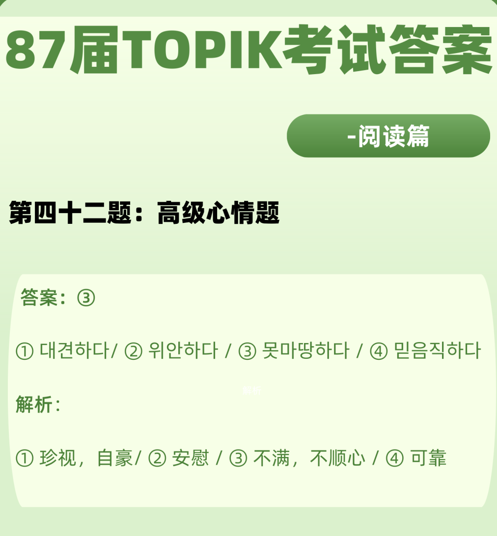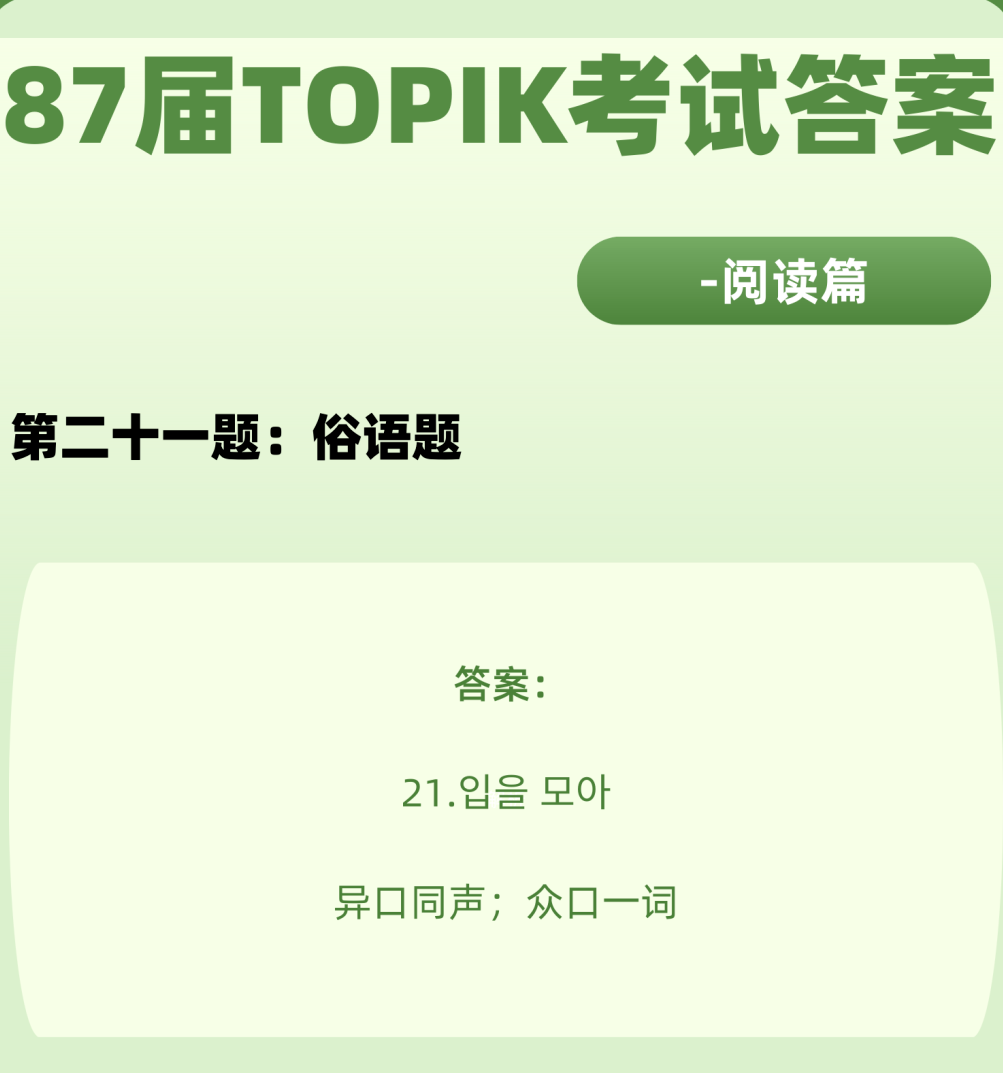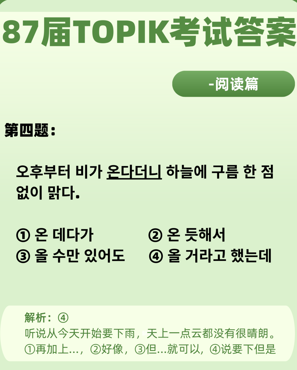 语法题,副词题,故事题,俗语惯用语题的选项都是在平时上课的覆盖范围内。当我看到第四道题目,语法题--기 무섭게这不就是高级考试班阅读部分最后剩下的时间里老师把一些大家会觉得比较难的语法做梳理时清清楚楚提到的,周五提到,周天考试,大家应该能记得,不用看前后句就应该知道选择什么答案了对吧?还有高级故事题的答案못마땅하다也是在最后一节课提问了大家,입을 모으다这个惯用语也问到过。