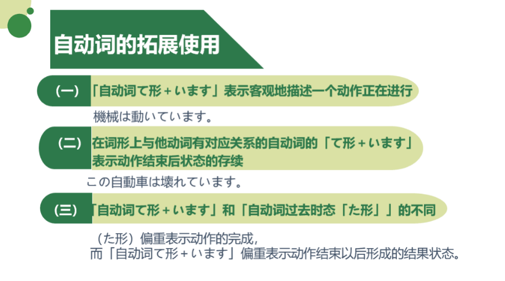 三个例子分别描述了“雨的状态”,“我(自发的完整动作)起床”,“小李的能力”。