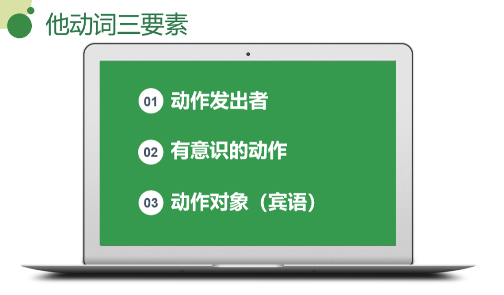他动词应用在句子中时需要有三要素来支持(发出者和动作对象有时可省略)。