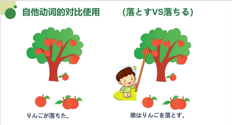 落ちる是自动词,例句描述苹果的状态。“苹果落地”。