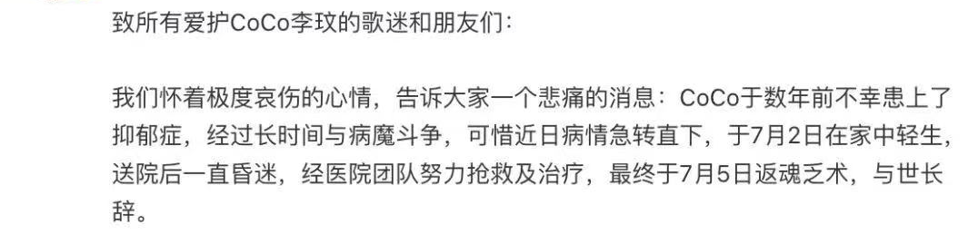 昨日,歌坛唱将coco李玟因抑郁症在家中轻生,谁也没有想到那个曾今闪闪发光、充满活动和能量的人会这么快跟我们辞别。