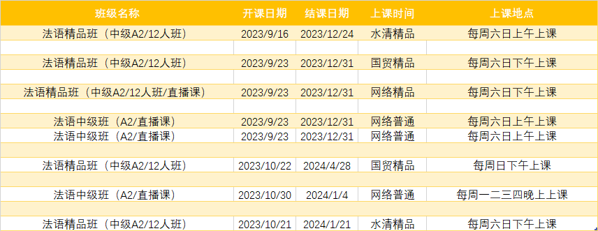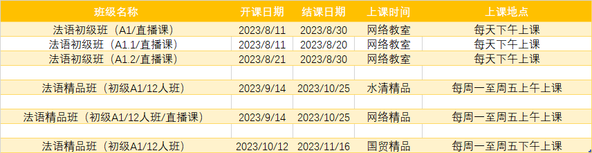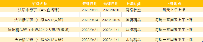 更多法语A1,A2课程排期及优惠