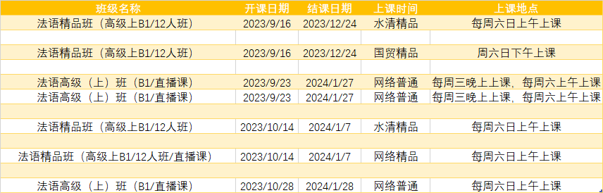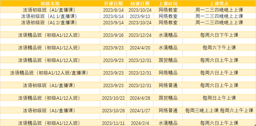 更多法语A1,A2课程排期及优惠