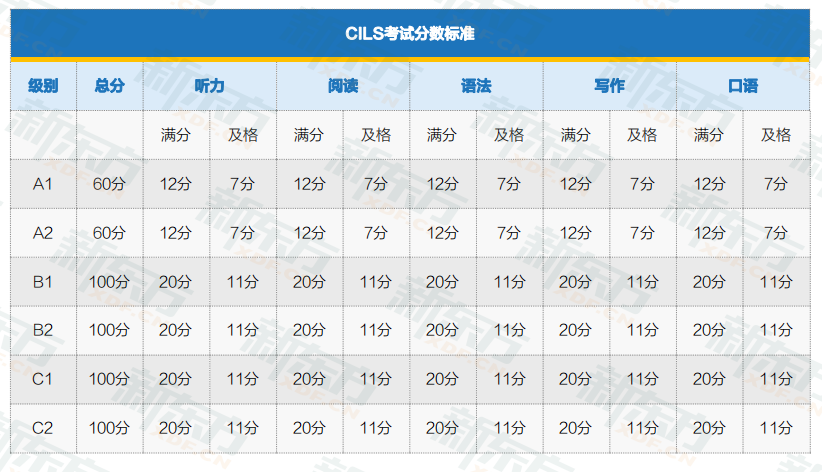 CILS考试由五个部分组成:听力、阅读、语法结构分析、写作和口语。每单项成绩达到及格标准视为合格,将获得相应语言证书,部分项目未达标可在18个月内补考单项。