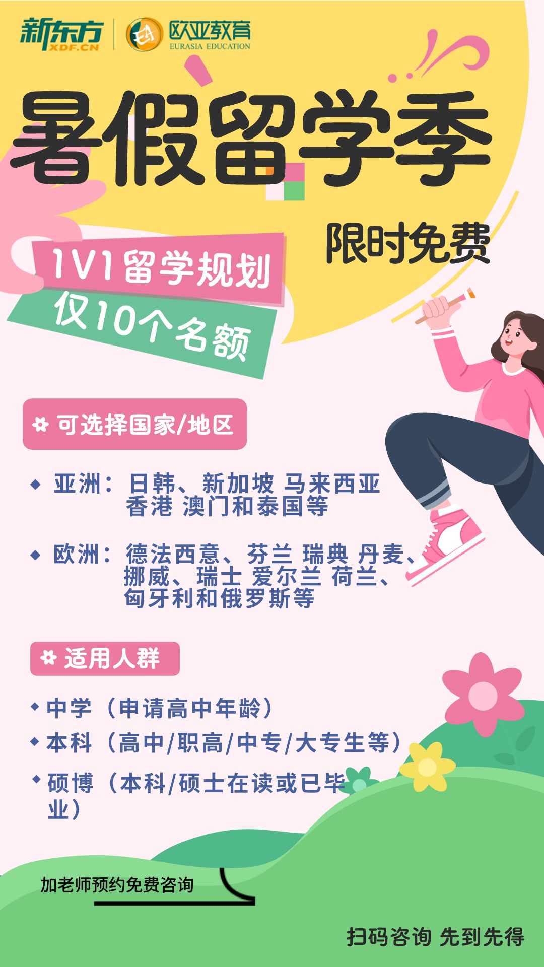 为帮助更多小伙伴了解海外留学现状,学会正确规划留学,新东方开展”欧亚教育免费1V1留学规划”活动!