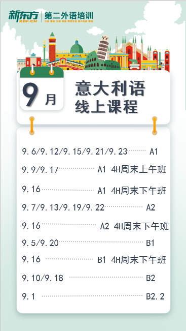 篇幅有限,更多9月意大利语初级、中级、高级、在线课、面授班,扫描下方二维码在线咨询。