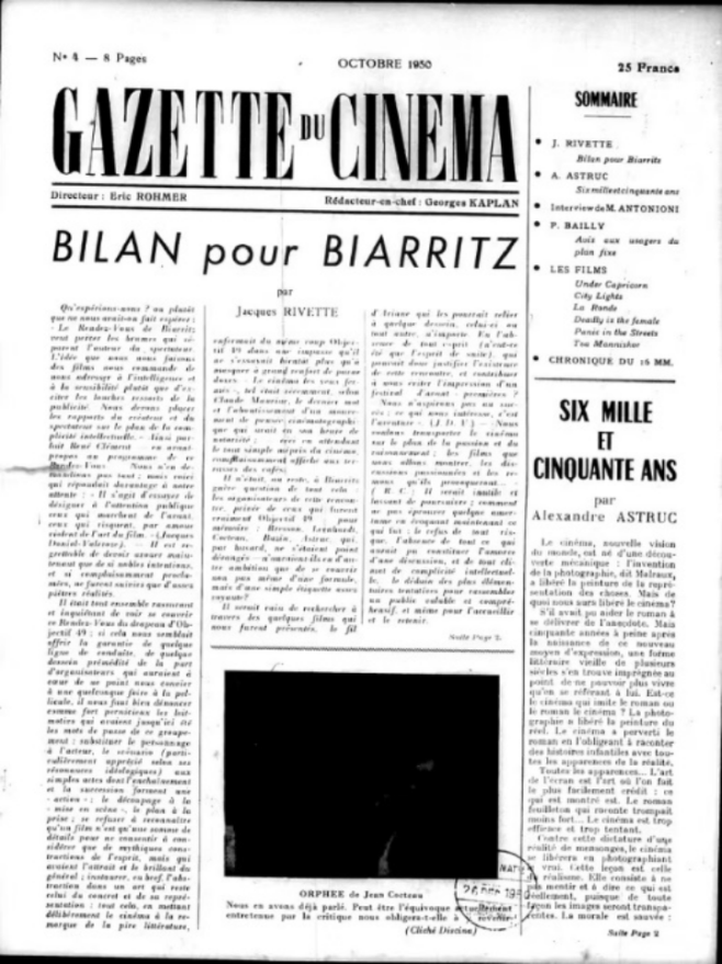 1950年,刚入学一年的戈达尔心思已经完全不在学业上了,他与这些朋友一起创办了《电影公报》(Gazette du cinéma),并以影评人(critique de cinéma)的身份,为巴赞(André Bazin)创办的《电影手册》(Cahiers du cinéma)发表影评。这一写就是十年。