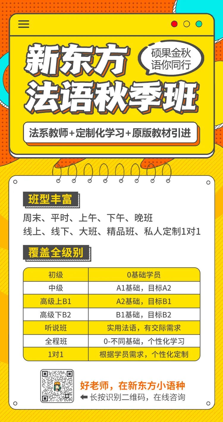 篇幅有限,更多10月法语初级、中级、高级、在线课、面授班,扫描下方二维码,在线咨询~