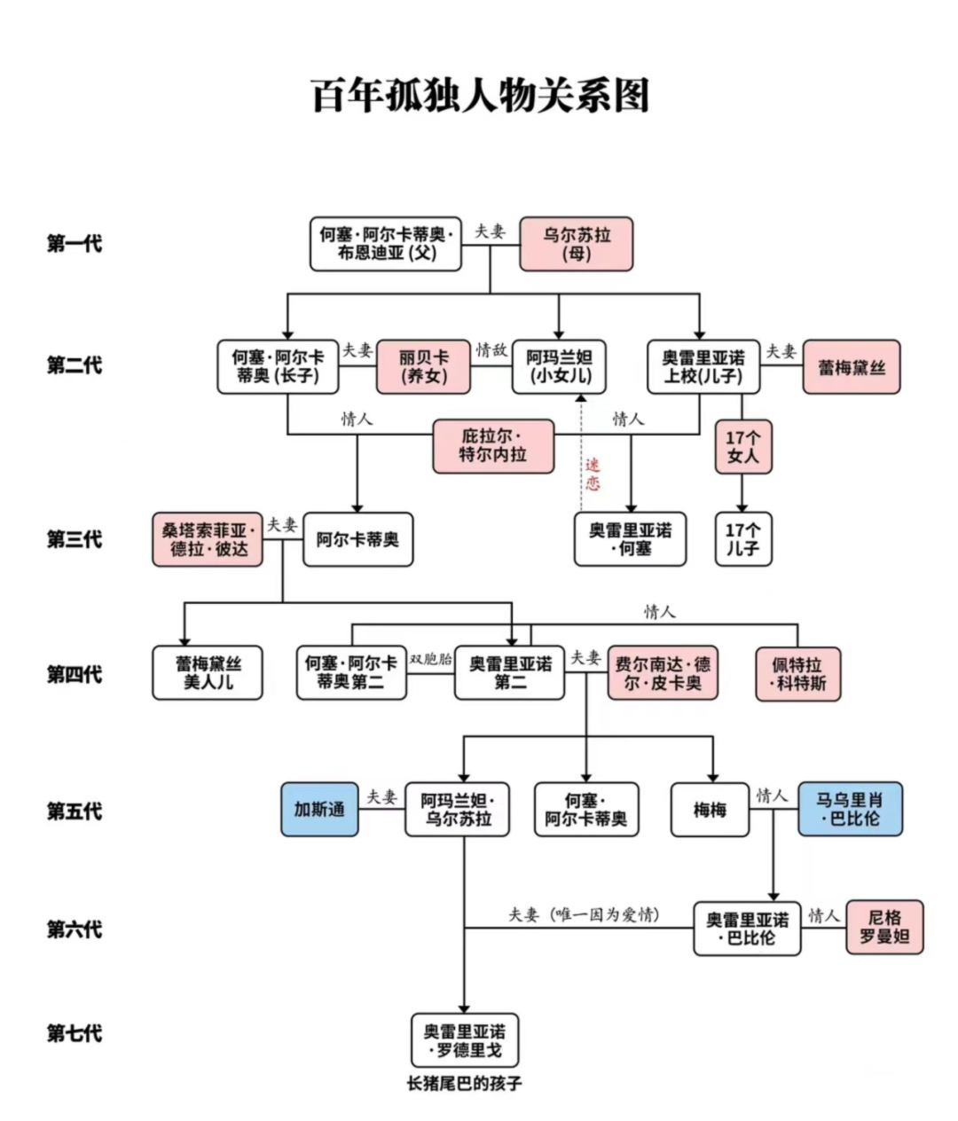 书虽精彩,然而全书26.2万字,横跨了一个家族7代人的命运,跨越了100多年。由于西方的命名方式,我在翻阅的时候,常常需要对照网上的百年孤独人物关系图,一共打开三次,全都草草结尾