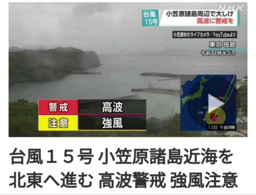 完整的句意为:台风15号从小笠原诸岛近海向东北方向进发,戒备海浪、强风灾害。
