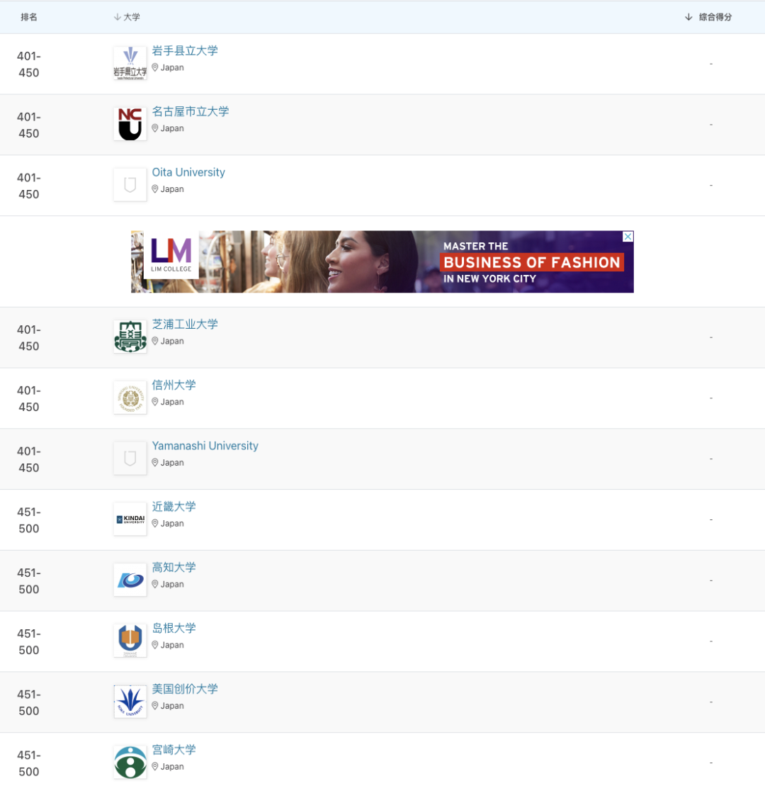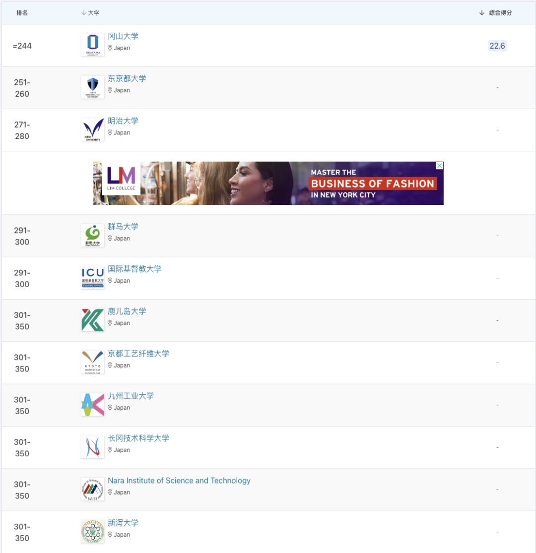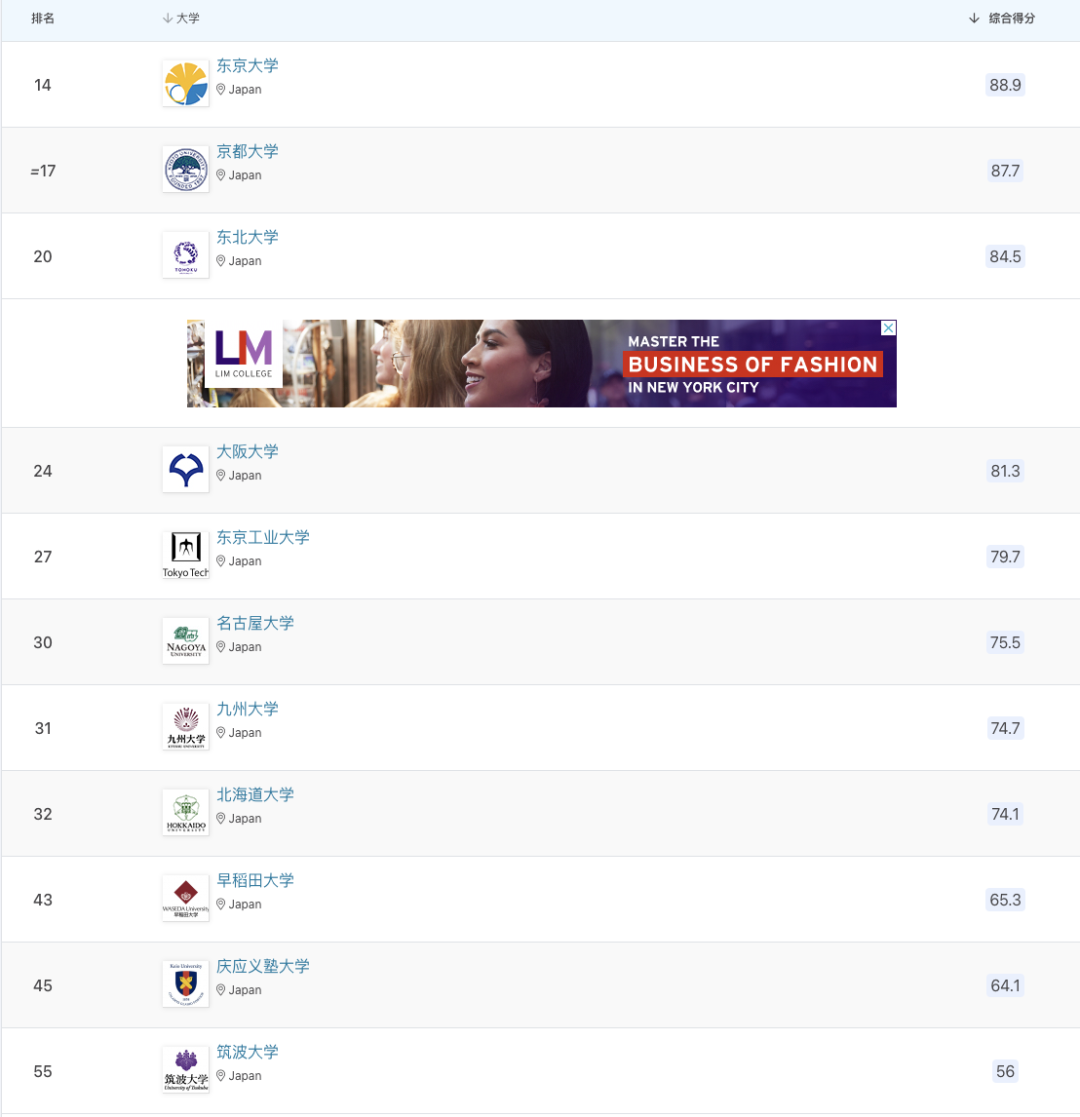 •东京大学下降3位,位列亚洲第14,日本第1。