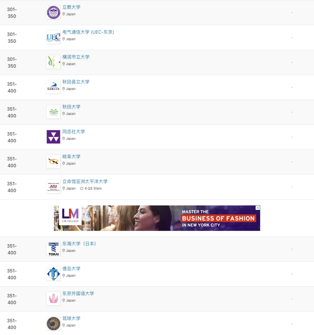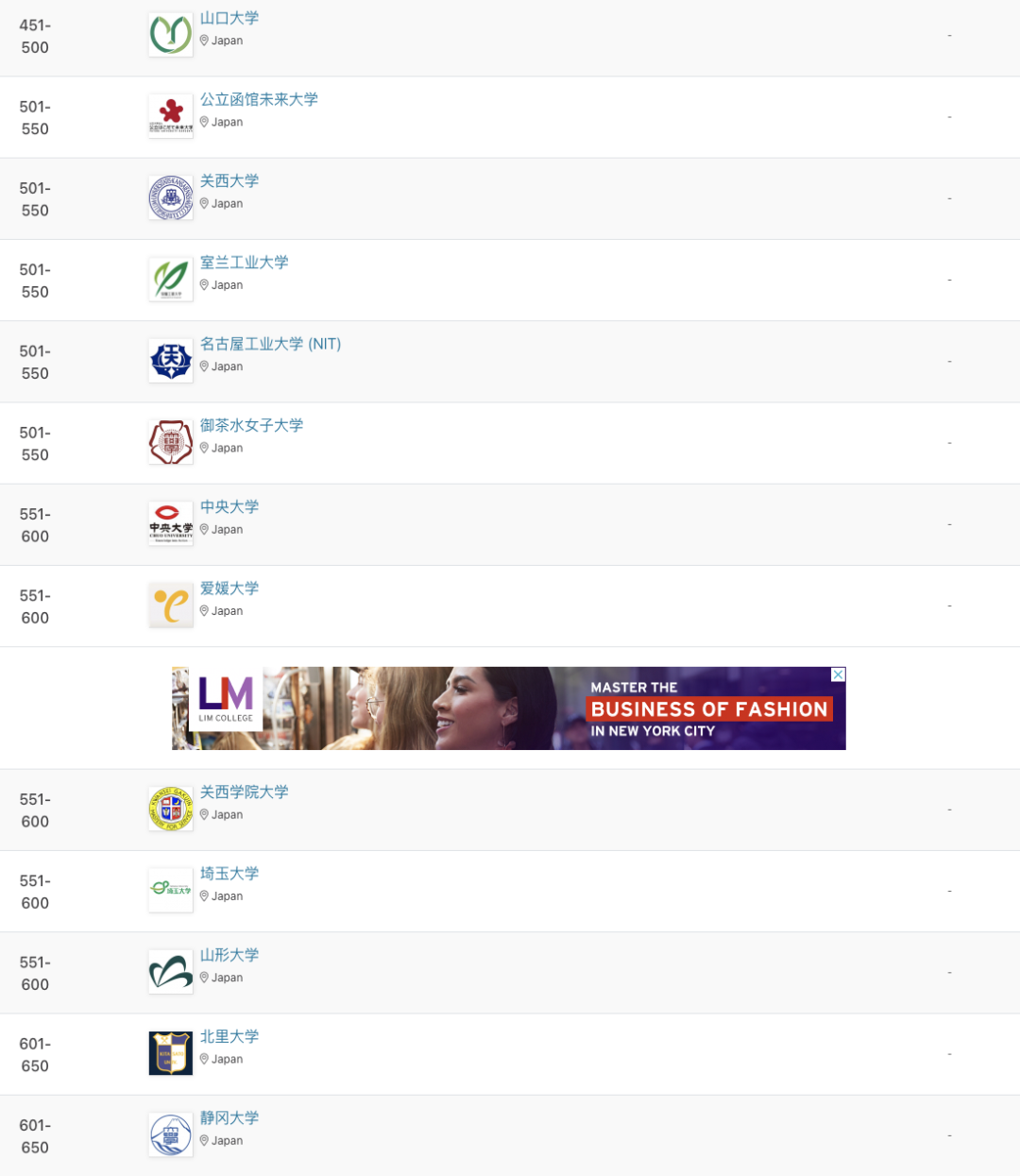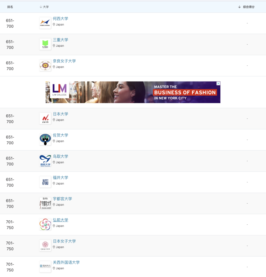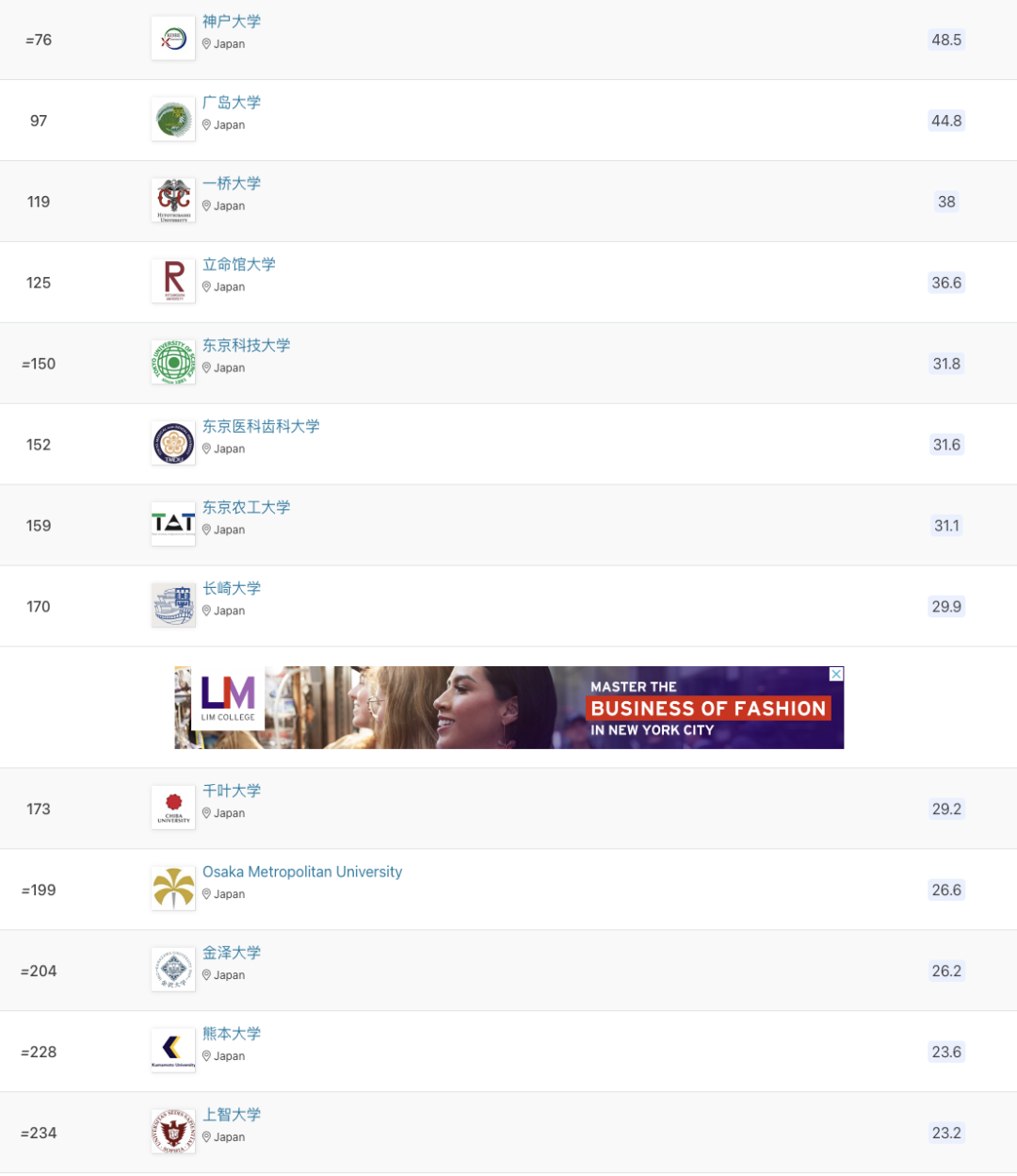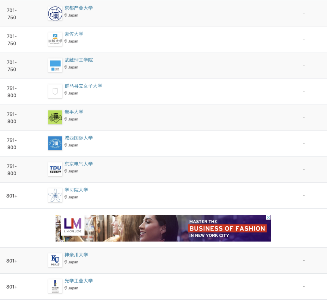 •此次,日本共有96所院校上榜,较去年减少10所,其中13所跻身亚洲前100。