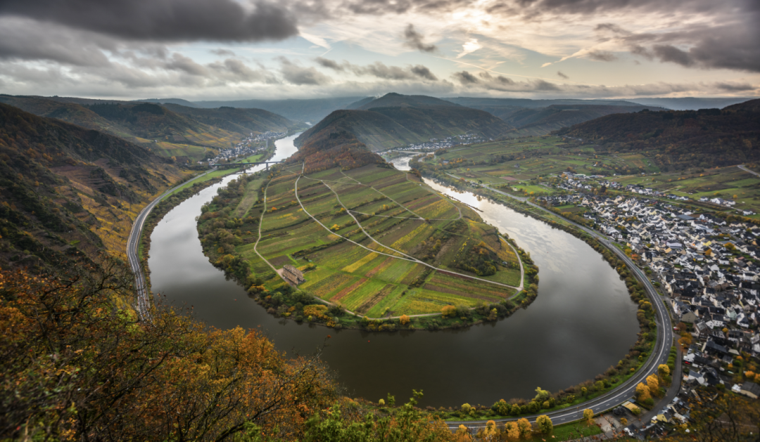 顺着河道而下,引入眼帘的是著名的摩泽尔环。摩泽尔河在这里像一条巨大的手臂一般轻轻环抱着中间的山丘与村落,静谧而又美丽。
