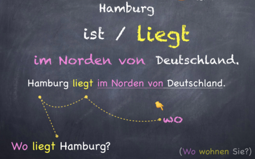 “汉堡”+ 动词(liegen 或 sein) + im Norden von + 德国。