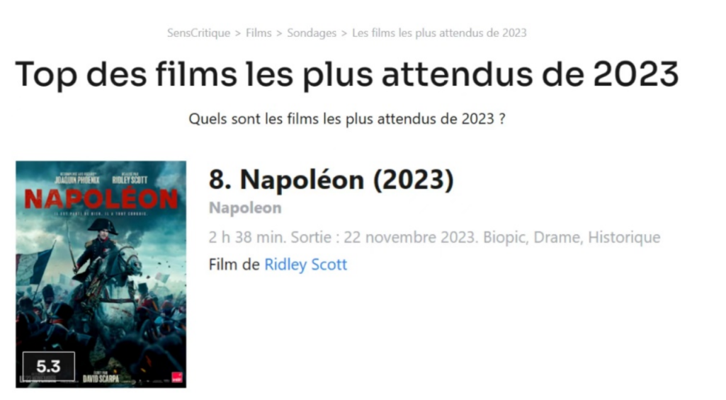 电影一经上映,便在法国引起了不小的轰动。影片在法国影评网站Senscritique(法国豆瓣)获得5.3分,并被列入2023年最值得期待的电影第8名。不少法国观众被该片恢弘的战争场面和极致的情感纠葛所吸引,纷纷给出好评。