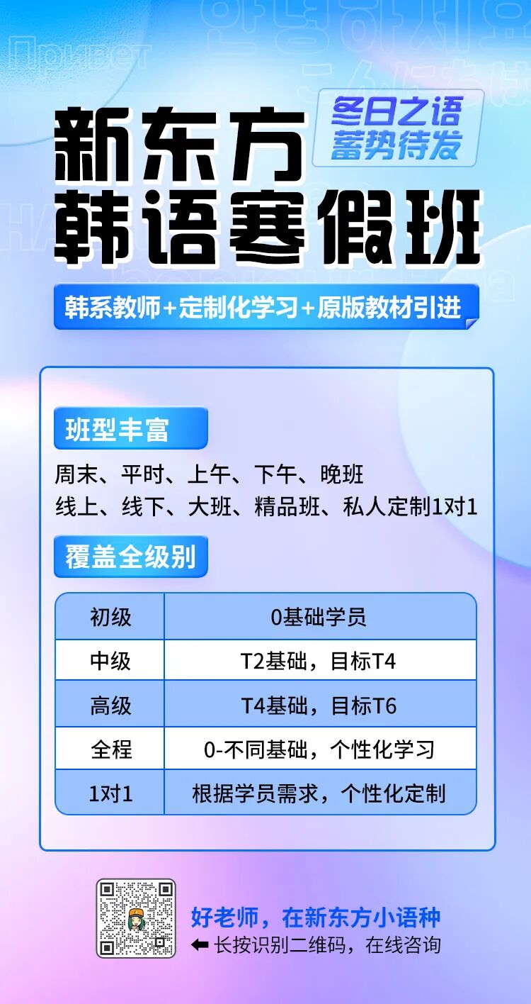篇幅有限,更多寒假班韩语初级、中级、高级、直播、录播课、面授班课程,扫码下方二维码在线咨询。