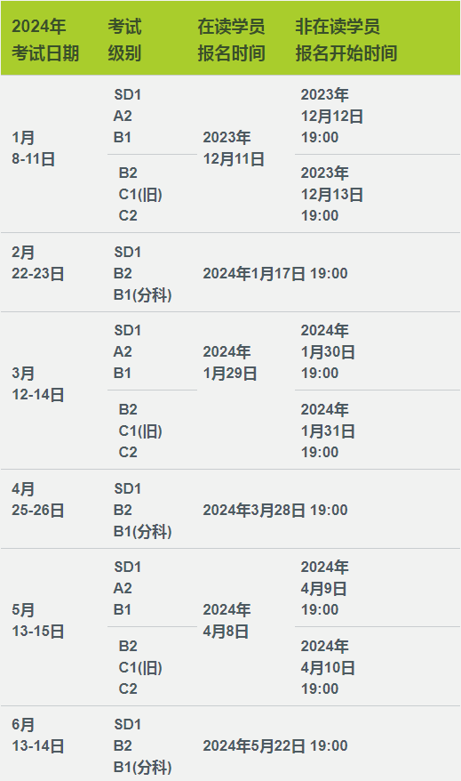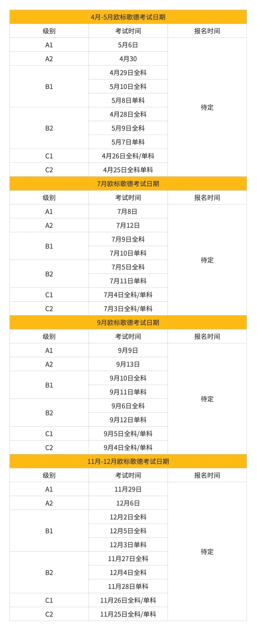 不同地区歌德学院,报考时间不一致。每一个考点开放的考试等级也不同。以下是目前已公布的考试安排。