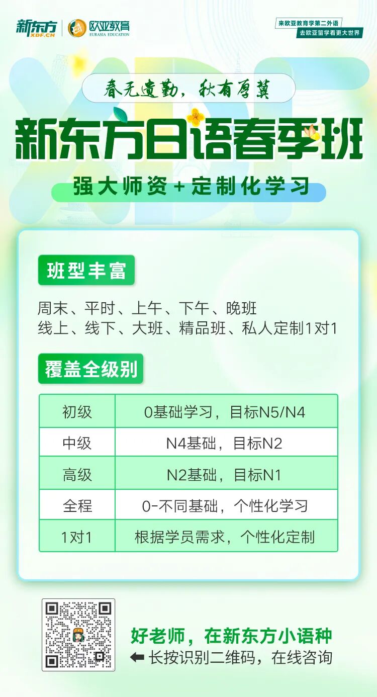 对于日语学习有任何疑问,或者在考试复习中遇到任何问题,推荐你听听新东方日语春季班~