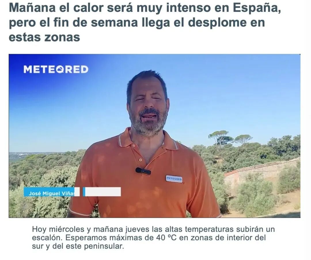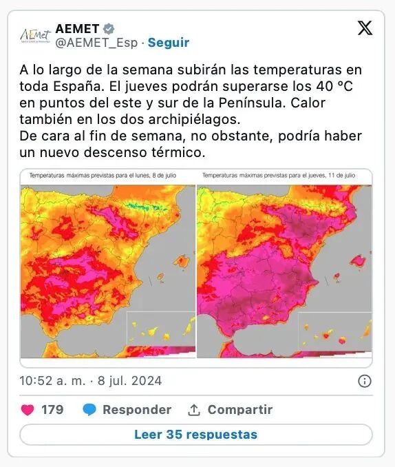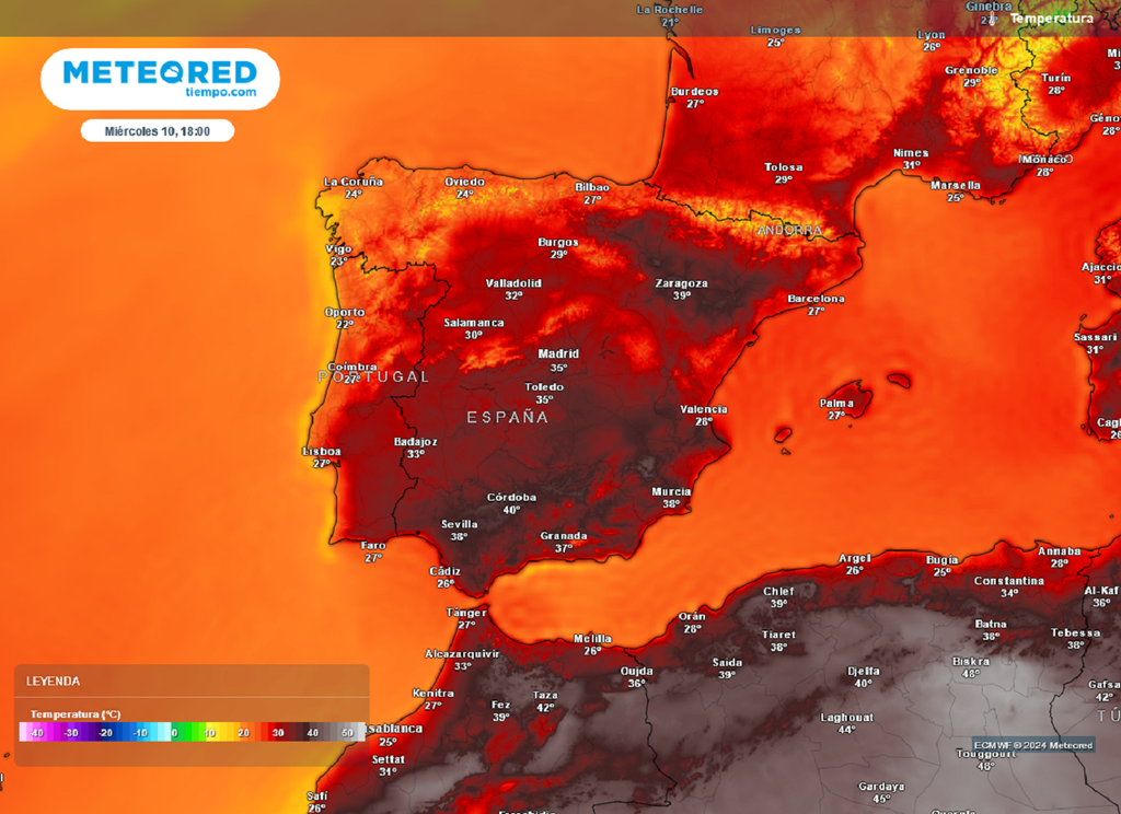 7月12日星期五,气温继续上升,伊比利亚半岛南部尤其炎热——穆尔西亚和科尔多瓦将达到40摄氏度,塞维利亚将达到38摄氏度。与此同时,来自大西洋的冷锋在伊比利亚半岛北部过境,将自西向东带来微弱和分散的降雨。在海拔高的地区,如泰罗尼亚北部(比利牛斯山)不排除发生风暴的可能性。