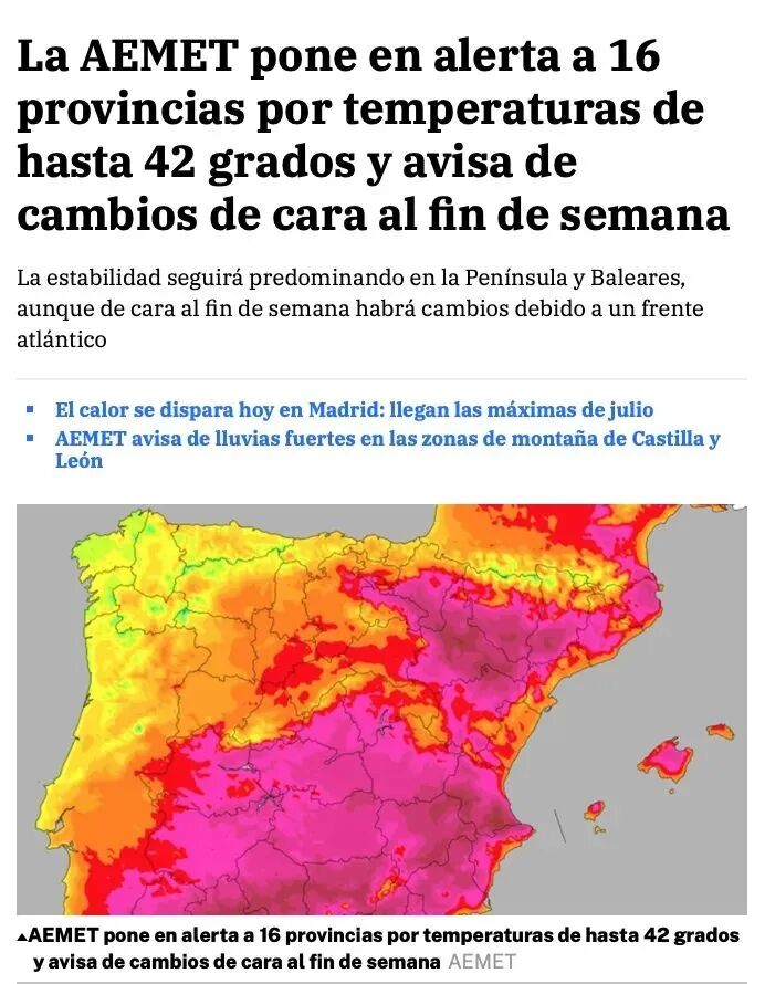 根据西班牙国家气象局(AEMET)的最新预警,接下来的几天,气温将进一步上升,一些地区会达到42摄氏度。