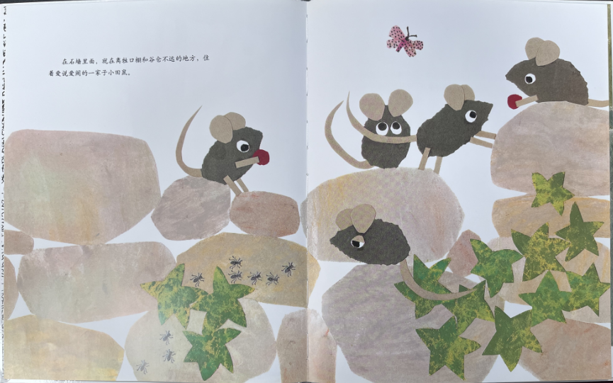 如书中这一页上写到:在石墙里面,就在离牲口棚和谷仓不远的地方,住着爱说爱闹的一家子小田鼠。
