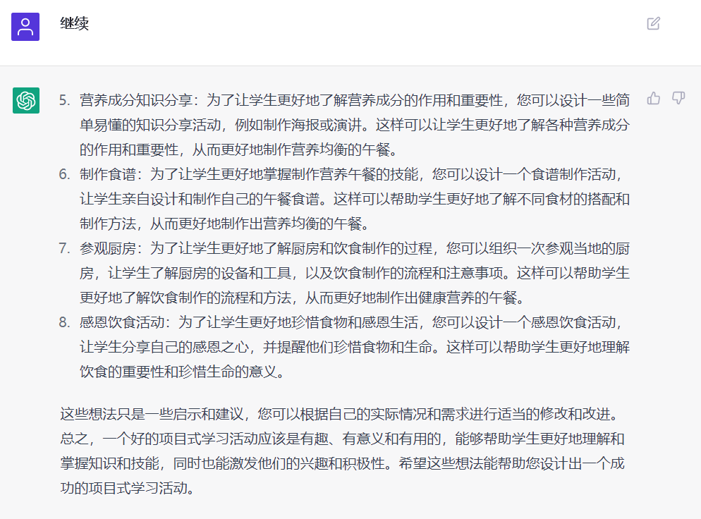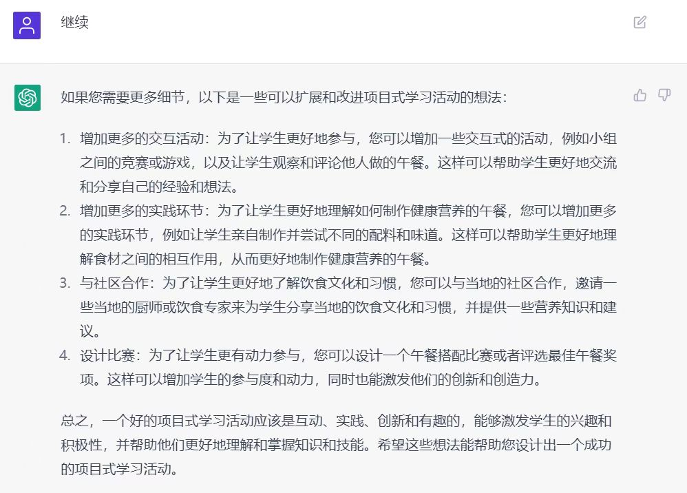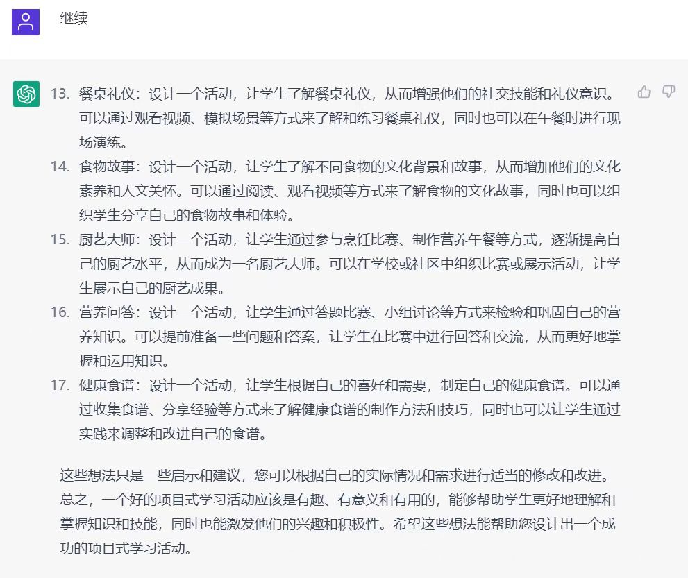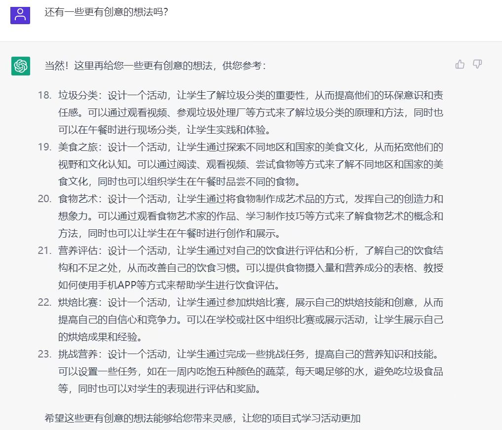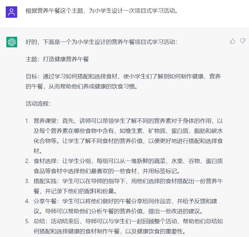安装这个软件后,我先试着给出“营养午餐”的主题,让它设计一次项目式学习,经过多次的交流之后,我发现它设计的活动已经能超过很多老师的认知了。