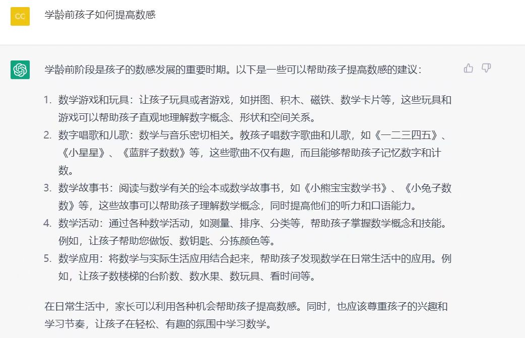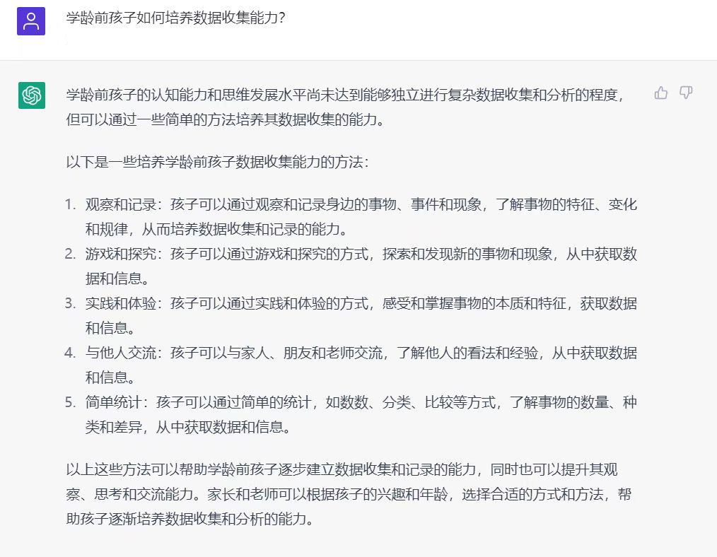 之后我就育儿问题和他聊了聊,关于如何提高孩子的数感,数据收集能力,孩子面对未来世界应具备的能力等,它的回答都能直接给出正确的方向。