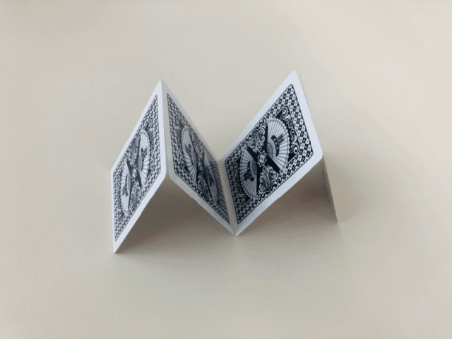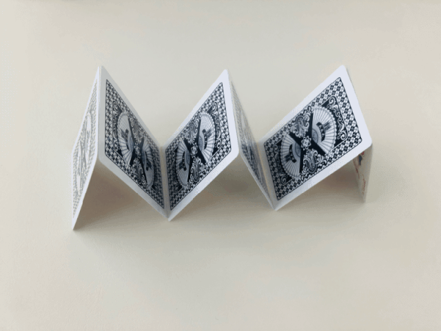 1、将两张扑克牌竖立斜靠在一起,组成“人”字形,如此重复,可横向摆放,也可以组成其它形状;