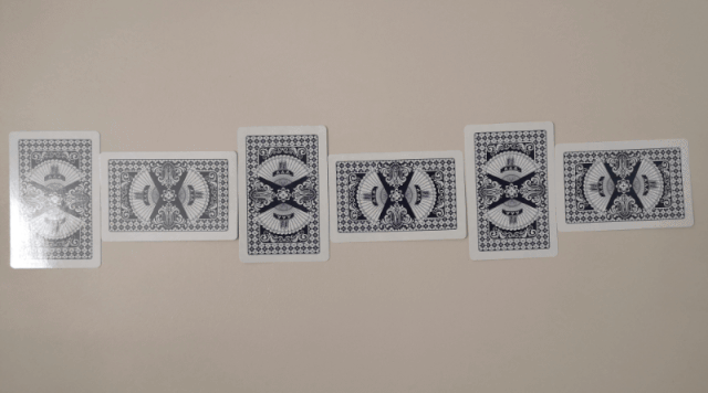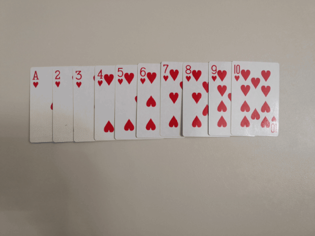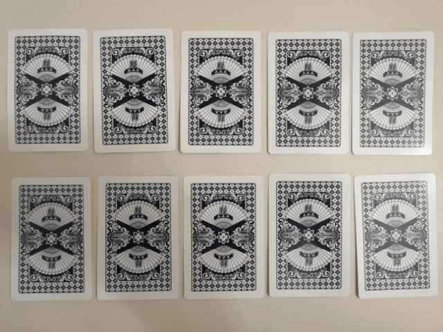 1、将10张牌依次摆放,倒扣在桌子上;