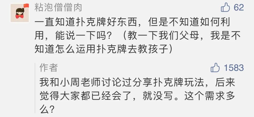 其实我和罗罗之前讨论过各种扑克牌游戏在数学启蒙中的使用,但一直以为大家都已经学会用扑克牌给孩子启蒙了,直到那天看到这条高赞留言,才发现需求这么大。