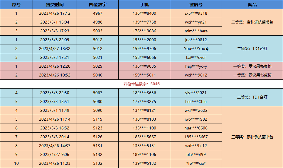 根据抽奖规则,中奖名单如下(最接近5046的是一等奖,次之二等奖,之后是三等奖):