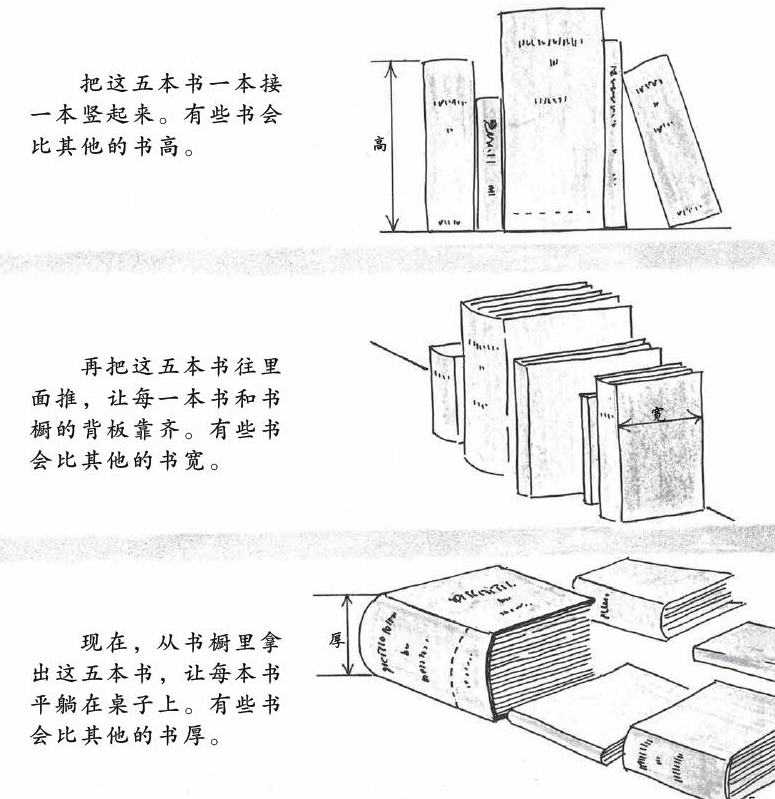 以前面提到汉声数学系列中的《三维求体积,二维算面积,一维量长度》为例,学龄前我就带着萌萌一起看,那时更多的是给她建立起对这些数学词汇的认识,理解生活中的相关现象,对长度、面积、体积有一个初步的认识;等到二年级学习了长度相关的知识,我会提醒她找出来再读这本书,此时她就会将其中关于长度的介绍与自己所学的知识联系起来;最近她们在学习面积,我看她刚开始也把面积和周长搞混淆,就和她再一起看这本书,通过里面生活化的例子,区分这两个概念。