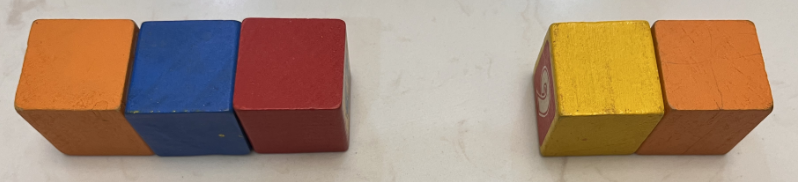 举个例子,最初孩子观察物品数数时,我们就要引导他从不同的方向观察。如下图,可以从左边开始观察,左边有3块积木,右边有2块积木,一共有5块积木,也可以先看右边有2块积木,左边有3块积木,一共有5块积木。虽然观察的角度变了,但是积木的数量不变。