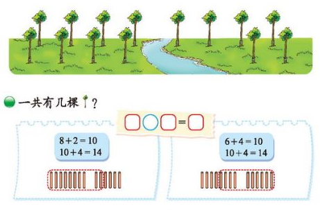 孩子先理解了凑十,才能进一步去感受凑十后再进行计算的便捷。在10个格子的基础上,再增加几个格子就是十几,这个也可以在摆一摆,画一画的基础上多次感知,孩子就会发现10加几的计算非常简便。