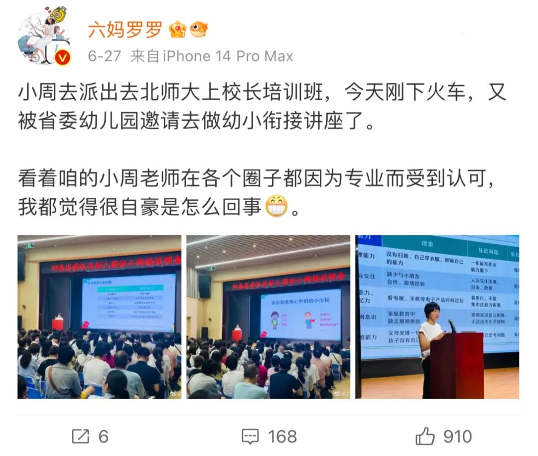上周,小周老师从北京回来的当天,又被省委机关幼儿园邀请去做了场讲座。看到现场图片时,我很为她感到自豪的发了个微博。