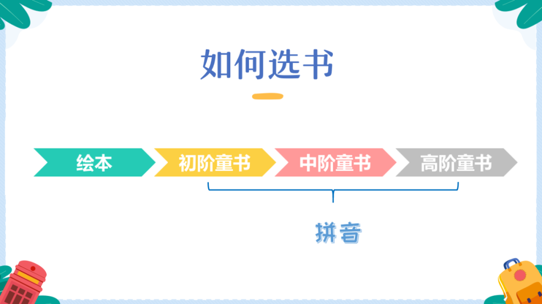 如何帮孩子选书呢?现阶段肯定是绘本,看大量的绘本,之后一定要有一个从初阶、中阶到高阶童书过渡的过程。简单地说就是图文占比,绘本文字20%图80%,然后慢慢过渡到图文各50%,之后文字80%图20%,最终到孩子中年级时开始看纯文字的书。