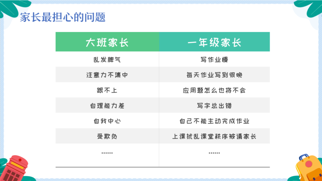 我们还是先要搞清楚到底什么是幼小衔接?可能每个人心中都有自己的答案,不着急做回答,请大家先思考一个问题,如果孩子马上就要开始他的小学生活,你最担心的是什么?大班家长通常担心的是孩子在学校会不会乱发脾气,学习跟不上怎么办,上课是否能集中注意力等等,但随着孩子小学生活的开始,最让家长头疼的问题,无一例外:写作业。