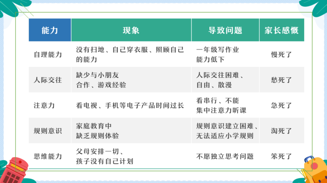 孩子的哪些能力是我们在这个阶段应该格外关注的呢?我们还是从问题出发,看看孩子在初入小学时会遇到的问题。