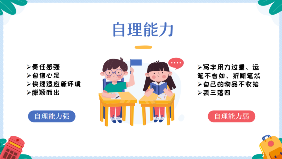 一个自理能力强的孩子,不仅能把自己的事情做好,还能帮助其他孩子,比如课前准备做得好的孩子、桌子整理的干净的孩子,很容易受到老师的关注,被表扬的机会就会多一些。而老师积极的评价会影响到周围同学对他的评价。这样,孩子的自我定位就会向积极的方面发展,孩子在这种正强化的过程中愈发约束自己的行为,同时也会带着愉悦的心情进入课堂,听讲质量随之得到提升,这就进入了一个非常好的良性循环状态。所以,家长一定要重视孩子的自理能力。