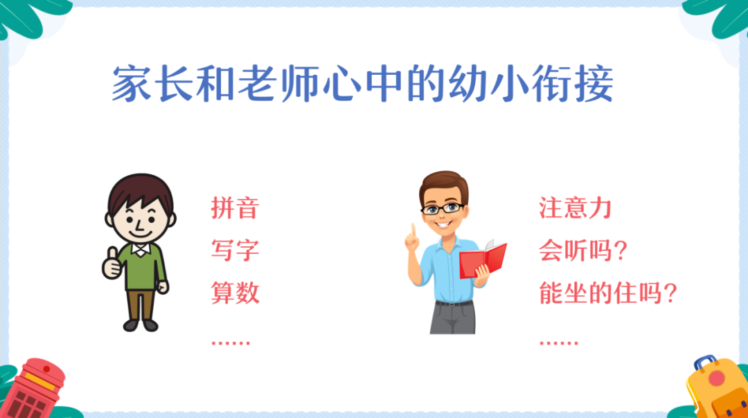 我们每年九月份都会看到网上很多段子,因为孩子的作业,家长们有吵架的,有血压升高的,还有心梗的。怎么解决问题啊,于是很多家长认为只要孩子提前上了幼小衔接班,提前学了拼音,算数,认为一年级开学就不会遇到这些问题了。如果只是这样理解的话,大家就把幼小衔接看的太狭隘了。