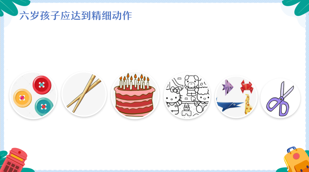 我们来看六岁孩子应达到的精细动作,大家可以对照一下。