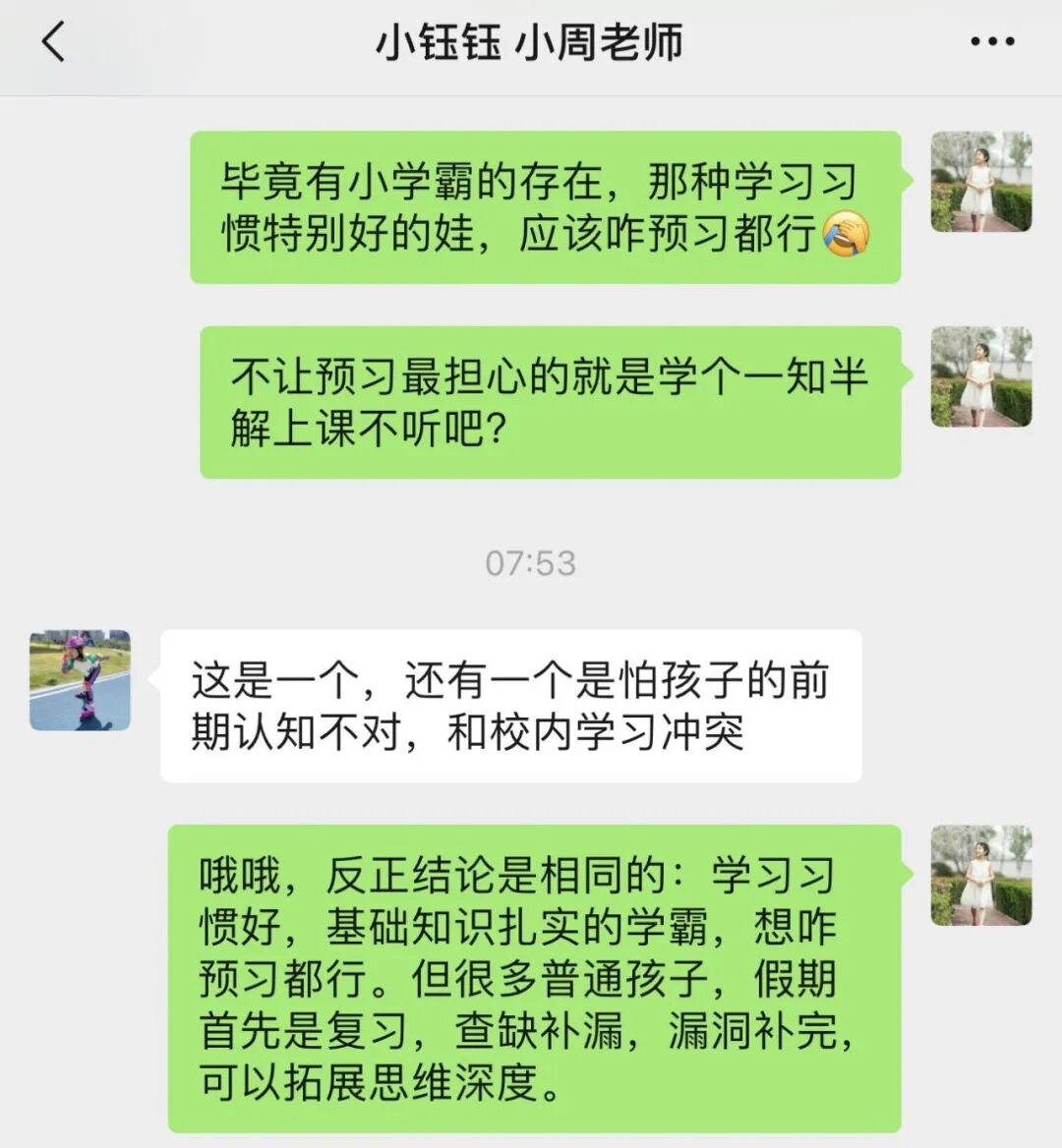 说这个,就是想跟大家再次强调,每个孩子性格不同,目标不同,一定要因材施教。比如小学数学要不要预习这个点,拿到小周老师的稿子后,我们俩又讨论了一下。