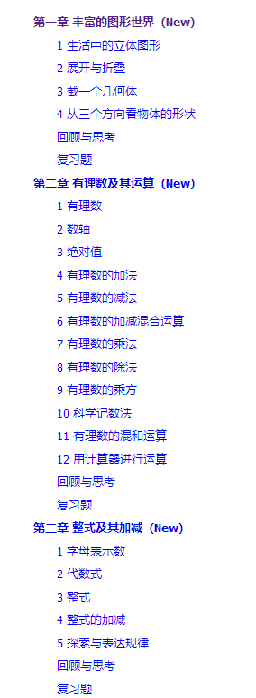 这是七年级的目录,第一章从简单的图形开始学习,将立体图形与平面图形联系起来,算是对小学知识的一个总结回顾,同时过渡到初中学习图形时很重要的一个思想“以运动的视角观察图形”。这个单元作为衔接单元,孩子学起来相对轻松,也算给了他们一个相对缓冲和适应的时间。