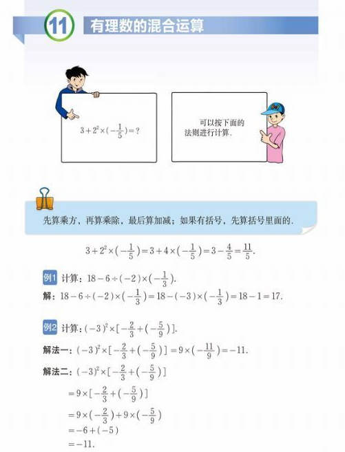 这是七年级上册中学习的《有理数的混合运算》,我们就看例1吧,这道题目首先要思考运算顺序,但题目中出现的小括号会给他们带来迷惑;接着往后计算的过程中出现了负整数乘负分数,孩子可能小学阶段整数乘分数还算不对,这里还要考虑符号的变化,就更不知从何下手了。如果题目中再合并上乘方、中括号、复杂的约分通分等,需要孩子将小学知识和初中知识综合起来运用,就更难了。