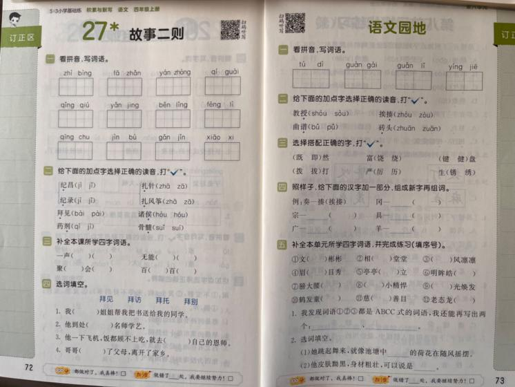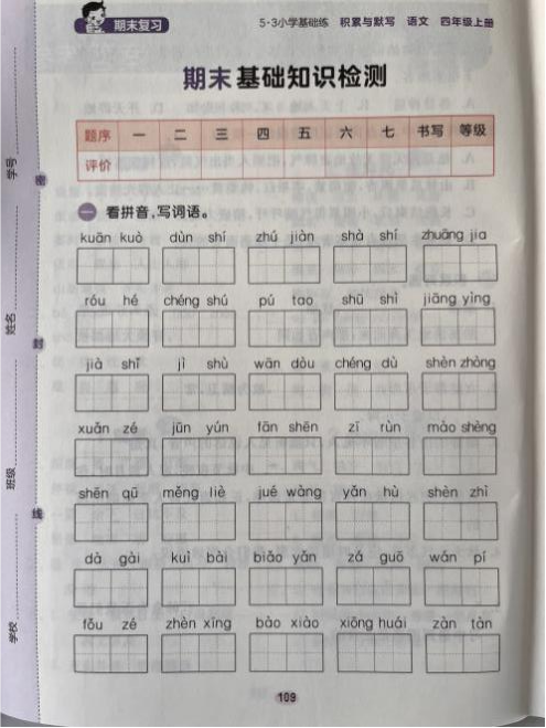 听写词语往往是复习的第一步,但听写与考试的模式不同,最终还是要看拼音写词语,范围也应拓展至近义词、反义词、选词填空等。借助一本基础知识类的练习册最简便,我们现在使用较多的是《积累与默写》,知识面全,题型也更丰富,日常配合教学做练习册,复习阶段做基础知识复习卷。家长给孩子买的《53全优卷》和《王朝霞真题卷》中也都有对应的字词专项练习,或者在网上搜索相关年级的字词专项练习。