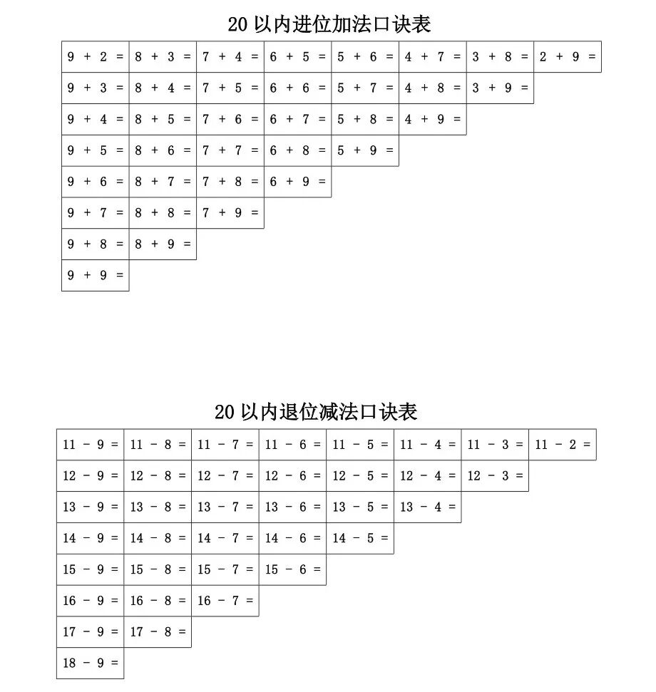 自从各种数学培训班比较普及,幼小衔接班流行,为了让家长尽快看到孩子的学习成果,老师会要求孩子背各种表格,甚至现在有些校内教学,老师也会让背诵。我就经常收到一些咨询,问下面这些表格到底有没有必要让孩子背。