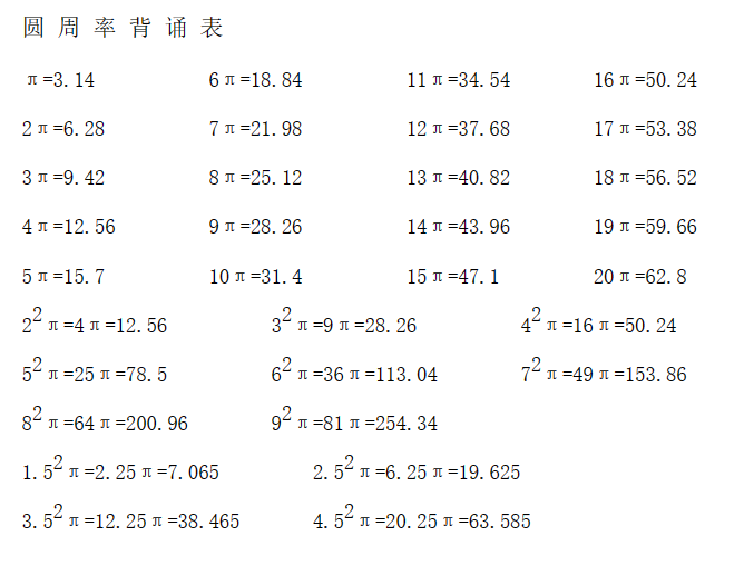 2. 乘法口诀、圆计算中的相关π值,因为出现频率高,计算量大,也需要背诵;
