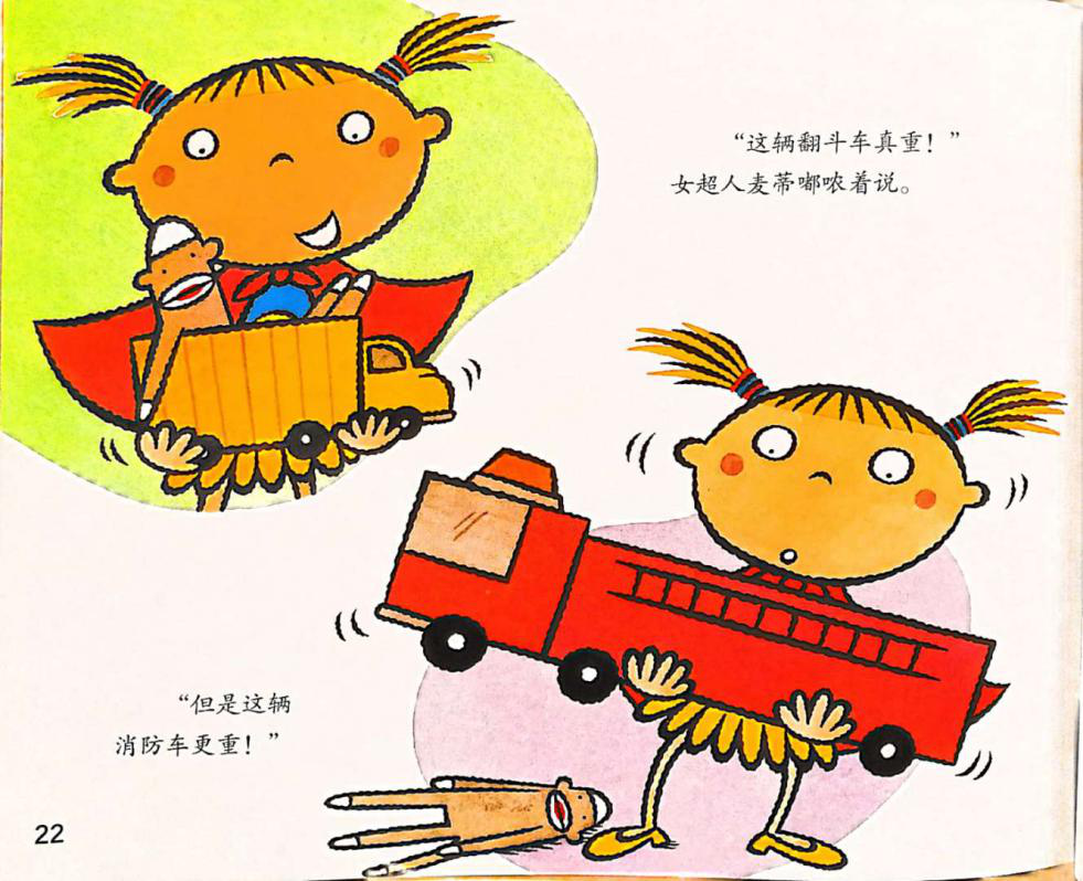 (▲《MathStar》阶段1《女超人麦蒂》这本书中,就描述了生活中,孩子在整理房间的过程中,对于轻重的感知。)